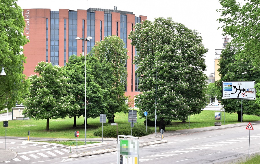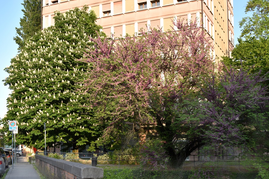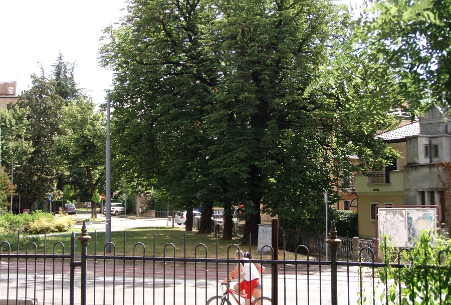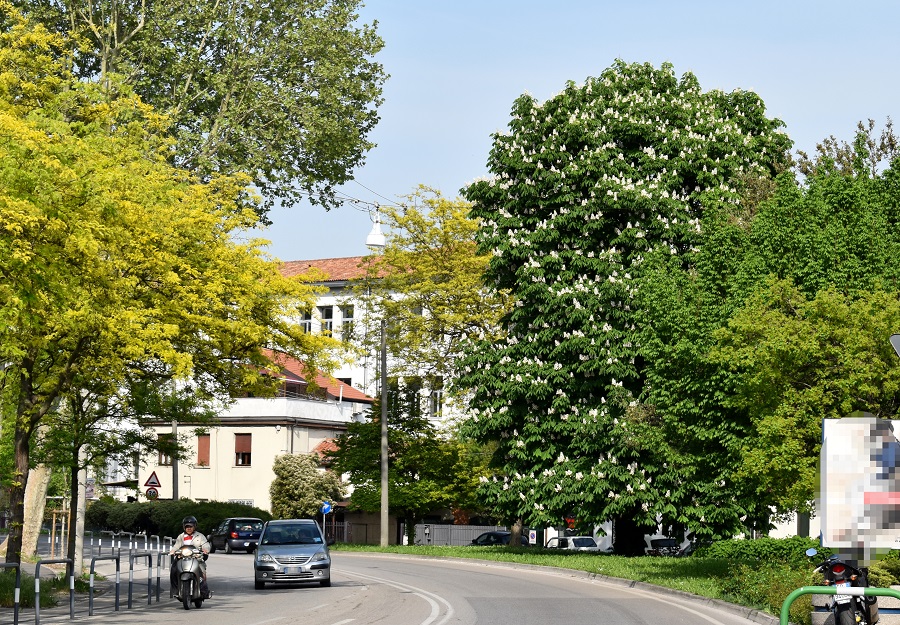 Foglia aggredita dalla larva di Cameraria ohridellaAncora una foto in città. Passeggiata Conciapelli, in primo piano un Cercis siliquastrum.Piazzale Stanga, l’albero più grande, e più vecchio, è un superstite di un maestoso filare di ippocastani che abbelliva il muro di cinta dell’Ex fabbrica di biciclette Rizzato.