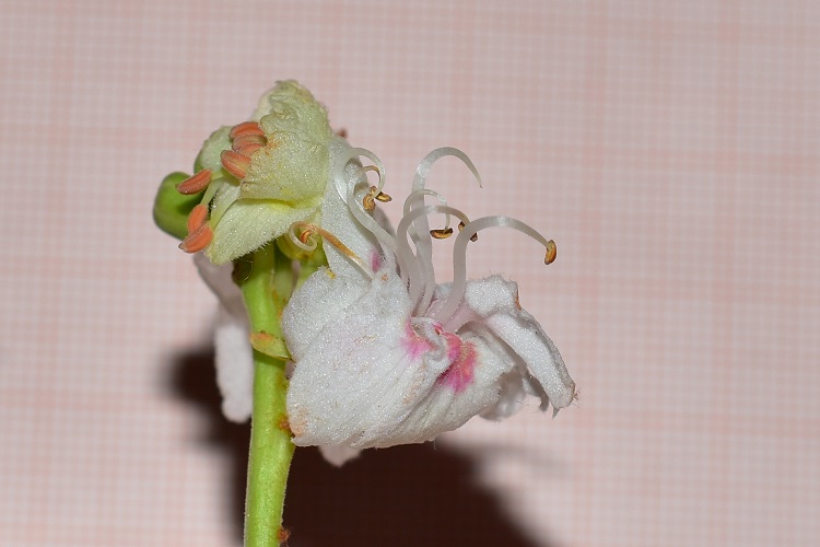 Foglia composta da 5-7 foglioline lunghe una ventina di centimetri, alquanto strette e seghettate (doppiamente seghettate a dire il vero) al margine. A guardarle sembrano mani protese verso l’osservatore, ma diversamente dalla mano umana le foglioline, le dita, partono radialmente da un unico punto, lì dove tutte insieme si attaccano al lungo picciolo.Caratteristici candelabri dell’Ippocastano (tecnicamente infiorescenza a pannocchia = un grappolo di grappoli).Gemma marzolina appena dischiusa, tutto è già in nuce, sia le foglie sia i fiori nel loro calice pronto a ergersi ritto per farsi ammirare.Fiore a simmetria bilaterale, cinque petali di cui due vessillari e dei restanti tre il centrale più grande.Petali macchiati di giallo o di rosso, come si è già dettoPetalo del vessillo, unghia lunga e stretta.L’attaccatura sul ricettacoloLunghi stami che portano antere arancione intensoDue sacche pollinicheOgnuna con due alloggiamenti.Non è facile scovare il pistillo ché ha lo stilo uguale in tutto al filamento degli stami e lo stigma appuntitoIncontro ravvicinato.Ovario pelosissimo. Da questa insospettabile struttura prenderanno forma gli aculei che ricoprono il frutto.