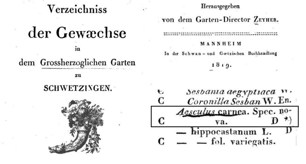 Aesculus x carnea Zeyh. Pubblicato per la prima volta in Verzeichniss der Gewaechse in dem Grossherzoglichen Garten zu Schwetzingen, Mannheim, 1818, pagina 12. Autore Johann Michael Zeyher, dal 1804 capo giardiniere del Giardino del Castello di Schwetzingen.