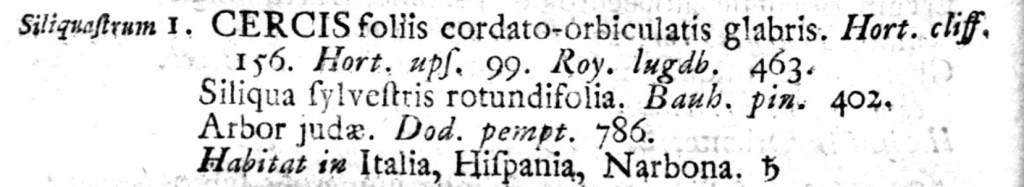 La pagina 374. Linneo ci informa che le foglie sono perfettamente circolari e cordate. Vecchi nomi sono Siliqua rotundifolia riportato da Bauhin e Arbor judae, da cui il nome volgare. Tournefort lo chiamava Siliquastrum, ed è strano che non sia citato.