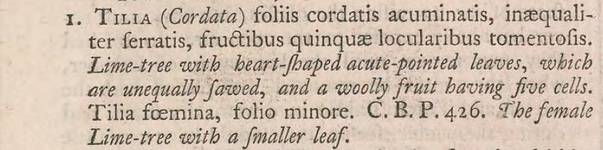 Tilia cordata Mill. Nome imposto da Philip Miller nel suo celeberrimo Gardeners Dictionary, Londra, 1768, ottava edizione, alla pagina denominata con la sigla TIL-TIL. Miller, giardiniere di Chelsea, fu fiero oppositore della nomenclatura linneana, di cui ritardò l’adozione in Inghilterra per decenni. Poi cedette vinto dalla realtà dei fatti, e nell’ottava edizione del Dictionary finalmente si adeguò.