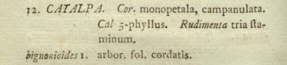 Catalpa bignonioides Walter Nome imposto da Thomas Walter botanico americano di origini britanniche. Lavorò tutta la vita ad un libro, fatto pubblicare in Inghilterra nel 1788 da un suo amico col titolo Flora Caroliniana, dove descrive numerose specie della Carolina, il luogo dove abitava.