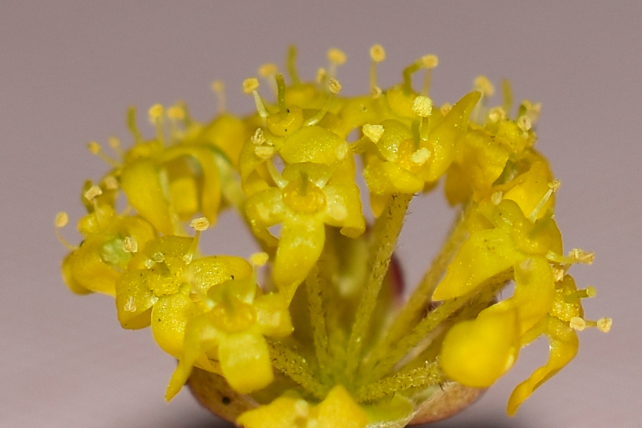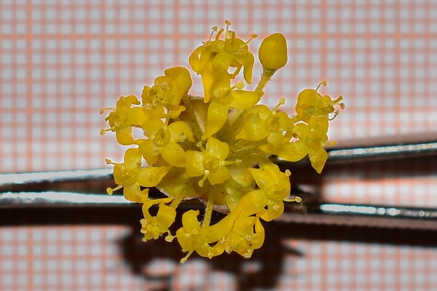 Uno degli esemplari di Via Cadorna in una foto dei primi di Marzo.Fiori piccoli raggruppati in mazzetti tondeggianti, in realtà la più classica delle infiorescenze a ombrella.Quattro petali (uno ne ha tre ma è fuori ordinanza) e quattro stami alternati.Si distinguono, con una certa fatica, i pistilli verdi e serpeggianti. Ed ecco il tutto in una foto a maggiore ingrandimento (aggiornamento 8 Marzo 2022).