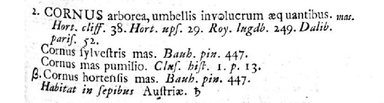 Cornus mas L. Il nome fu imposto da Linneo nel celeberrimo Species Plantarum (Stoccolma, 1753). Il genere deriva da ‘ker’ una radice indoeuropea che vale duro (in riferimento al legno), quanto a ‘mas’ è il latino maschio, vale per pianta rustica.