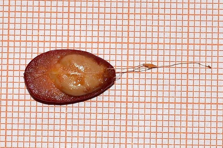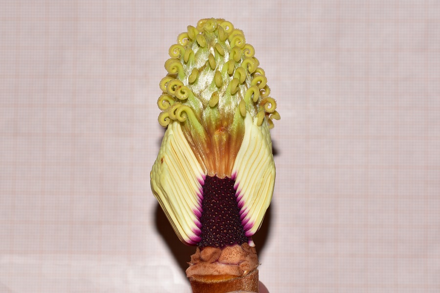 Grandi sepali che racchiudono corolla e organi maschili e femminili.I segmenti gialli che si sovrappongono fra loro sono stami, mentre in alto assiepati, come squame di una pigna, i pistilli. Nella foto le strutture verdino sono gli ovari, e i ricciolini gialli stigmi. A maturazione gli stami portano il polline per tutta la loro lunghezza, e gli stigmi, diventati caramello, si ricoprono di una secrezione atta a convogliare il polline verso l’ovario. Gli stami, nella foto simili a fiammiferi svedesi, mano a mano si staccheranno tutti.Liberando la parte più bassa del ricettacolo.Nella foto si vedono bene le cicatrici lasciate sul ricettacolo da sepali, petali e stami nell’ordine. Ma si può apprezzare anche la struttura arcaica di questo intrigante fiore. Nella parte più alta dell’infiorescenza si distinguono i singoli pistilli che sono ormai diventati frutti...…questi ultimi compaiono in giugno, inizialmente verde chiaro imbruniscono a maturazione.Frutti a maturazione. I semi sono rosso vivo, brillanti e profumati anch’essi.L’infruttescenza è composta da tante tasche che si aprono a maturità e portano ciascuna un solo seme.Tecnicamente si dice capsula a follicolo. I semi sono ellissoidi con i tre assi di lunghezza diversa (ricordano certe caramelle schiacciate e un po’ allungate) Sotto il tegumento rosso, che la pianta fabbrica a esclusivo beneficio degli uccelli, un involucro coriaceo racchiude l’embrione.Sezione del seme. Il filamento a destra trattiene il seme alla sua tasca permettendogli di penzolare per giorni e di richiamare, magari con la complicità del vento, l’attenzione degli uccelli.Corteccia liscia e a lenticelle da giovane, ben presto si fessura in placche irregolari.