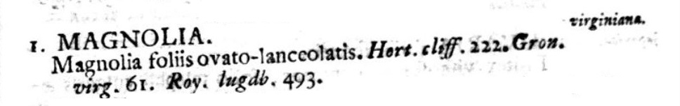 La pagina 1082. In alto ho riportato l’intestazione della pagina: ‘Molti mariti, molte mogli’, che nella terminologia sessuale del Nostro sta per: molti stami e molti pistilli. Segue il nome del genere, dovuto sempre a Linneo. Per ultimo il nome della specie, con il riferimento a Philip Miller, il Giardiniere di Chelsea. La pagina 535 di Species Plantarum (1753), dove compare la Magnolia virginiana, ma non la grandiflora che forse arrivò solo dopo il 1753 in Europa.