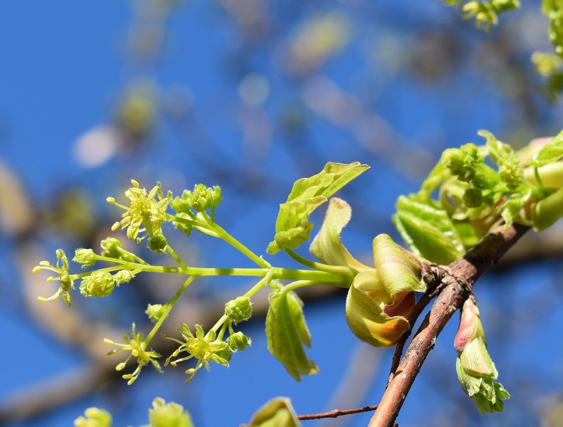 La pianta fiorisce in Aprile, i fiori sono verdognoli, piccoli e poco appariscenti, e tendono a confondersi con le giovani foglie ancora verde tenero, tutto ciò contribuisce a far passare inosservato il fenomeno. Ed è un peccato poiché lo spettacolo è dei più belli e delicati.