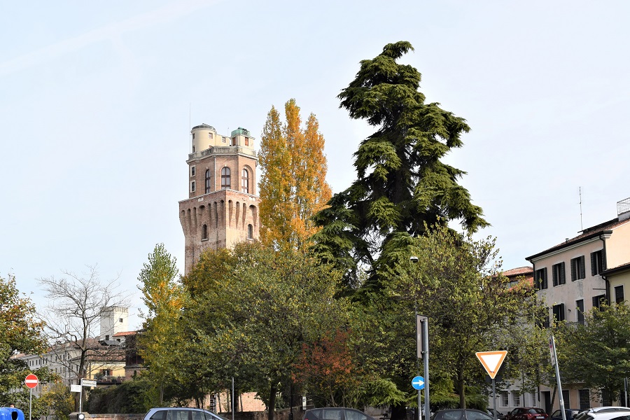 La Specola in Ottobre. Il Bacchiglione si dirama in due tronchi, a sinistra verso Riviera San Benedetto, a destra verso il Ponte delle Torricelle.La versione speculareIl lato della piazza che nella nostra mappa corrisponde alle zone 2 e 4. Da sinistra un alto pioppo cipressino, un olmo, ancora un giovane cipressino, un acero purpureo e, sullo sfondo, un cedro deodara.Un mese dopo, in Novembre. L’olmo ha assunto una provvisoria colorazione giallolimone, l’acero comincia a perdere le foglie dalla cima, i pioppi sono ormai spogli. Da questa inquadratura si capisce meglio la posizione del deodara che dimora il centro dell’aiuola (zona 4 della mappa).Sul lato destro del ponte un alquanto scarruffato Gelso (Morus alba, zona 9 della mappa) introduce alla piazzaAllargando lo sguardo oltre il Gelso restiamo rapiti all’apparire di decine di sfumature di verde e di giallo. Al centro della foto la macchia giallo oro di un altro Gelso bianco.Volgendosi indietro verso Riviera Paleocapa magnifici cipressini e un salice piangente (zona 10 della mappa)La stessa inquadratura della foto precedente ma un mese dopo (Novembre), i pioppi cipressini han quasi completamente perso le foglie mentre il salice, una delle ultime piante ad ingiallire, ha appena assunto la livrea autunnale.Superato il ponte due giovani ginkgo biloba ci accolgono con una splendida macchia gialloverde. Zona 5 nella mappa. A destra gli inconfondibili rami decombenti di un deodara.Cedro deodara con fiori maschili in Ottobre completamente verdi. Tra qualche settimana sbocceranno in una profusione di polline giallo.Guardando verso Via Riello, un pensoso Carpino dalla chioma ocra, raccolta e composta.La piazza in Ottobre, verso le zone 2 e 4 della mappa. In primo piano il breve filare di alberi di Giuda, che forse ricorderete in piena fioritura, dietro tre linee verticali inversamente elevate, complice il gioco prospettico, del deodara, del cipressino e della Specola.