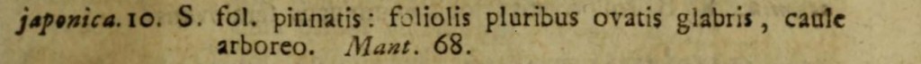 La pagina 287. La specie è collocata nella classe Decandria ordine Monogynia (come si vedrà gli stami sono separati). La descrizione si concentra sulle foglie e viene detto che il portamento è arboreo.Maggiori informazioni Linneo le fornisce a pagina 68 di Mantissa Plantarum dello stesso anno. Si apprende che le foglioline sono levigate da entrambe le parti, e che i fiori sono bianchi. Fenologia minimaAreale di origine (native range): nonostante il nome specifico, proviene da Cina e Corea.