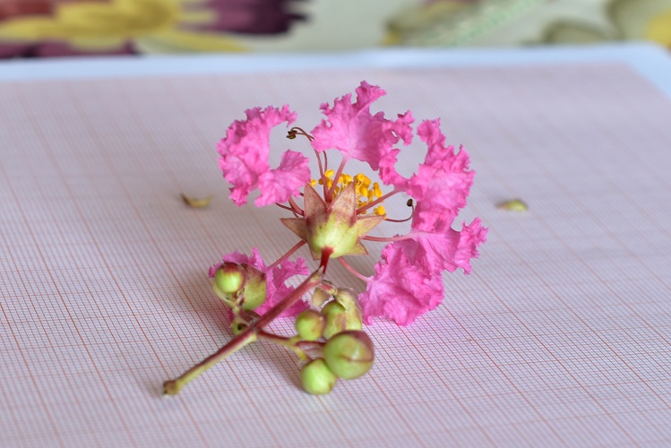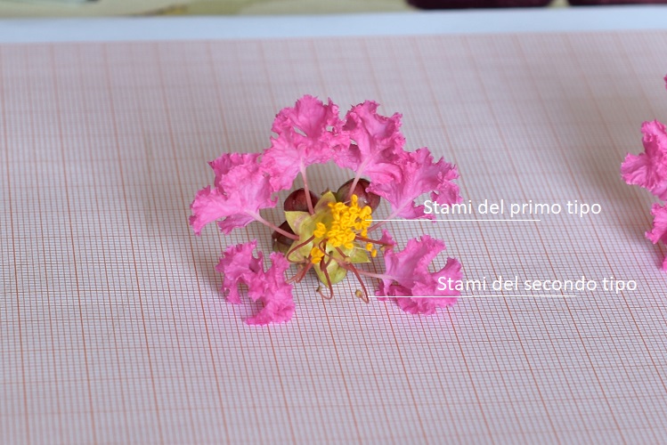 La cultivar Lagerstroemia indica ‘Bianca Grassi’Un giardino privato di una laterale di Piazza Mazzini.Ma torniamo ai fiori. Le gialle antere risaltano sul rosa carico dei petaliFiore dai petali singolari, arricciati in cima (lamina) e strettissimi, ridotti a un tubicino, alla base (unghia).I petali sono attaccati al calice fra un sepalo e l’altro.Simmetria esagonale, rispettata in corolla e……calice.