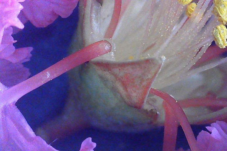 Una foresta di filamenti diafani sormontati da antere gialle con due sacche pollinicheEleganti stami dai filamenti fucsia e antere solcate da strisce viola scuroIl pistillo si mimetizza fra gli stami ‘alti’ e non è immediato trovarloStigma amaranto e dall’aspetto simile a certe caramelle gommose. Nella foto si distinguono, sulla sua superficie attaccaticcia, granuli di polline minutissimi.Ovario supero. Nella foto si riconoscono le attaccature degli stami alti, i filamenti scuri, e bassi, i monconi traslucidi.Sezione longitudinale dell’ovario. La placentazione (disposizione degli ovuli nell’ovario) è centrale.Una struttura verticale al centro che porta gli ovuliSezione trasversaleSingolo ovulo.I fiori sono disposti in pannocchie erette in punta ai rametti, carattere in comune col Lillà.E proprio ‘Lillà delle indie’ è uno dei suoi nomi comuniIncredibile fioritura in un’aiuola su Via Cernaia. (Foto Settembre 2020: troppo bello per non fare un rabbocco) Boccioli e peduncoliIl frutto è una capsula tondeggiante, che si schiude a maturità (deiscente).La divisione in carpelli è evidentissima, forma un fascio di meridiani. Foto in OttobreI poliLa capsula a maturità. Residui di calice apertura da tre a sei valve. Minuscoli semi alati.