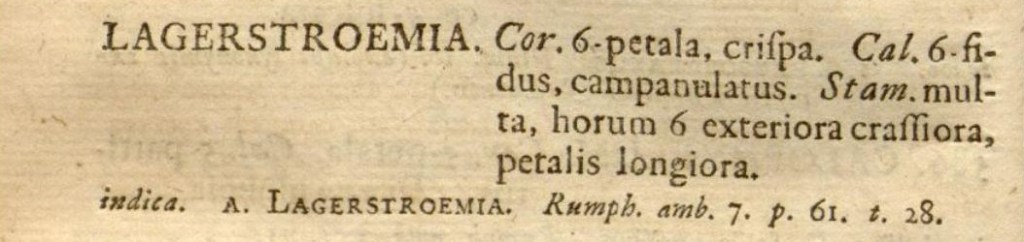 Lagerstroemia indica L. Nome imposto dal Linneo nel secondo volume della celeberrima decima edizione di Sistema Naturae, tomo II, Stoccolma, 1759