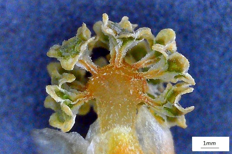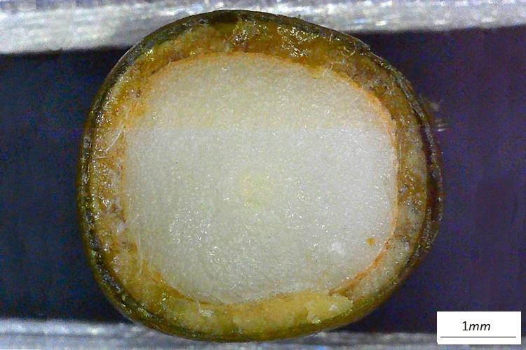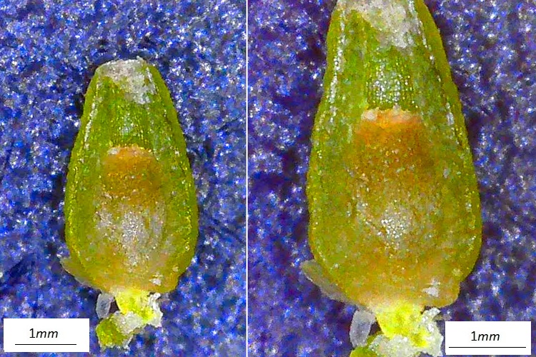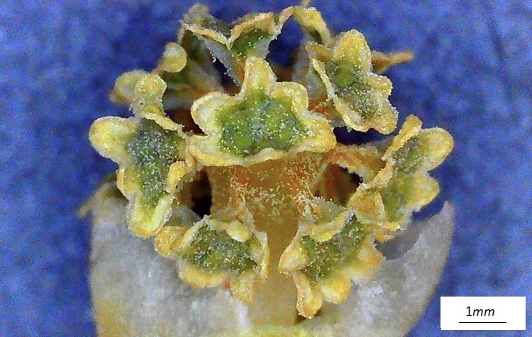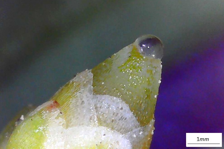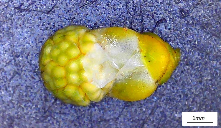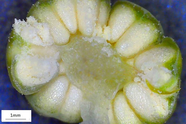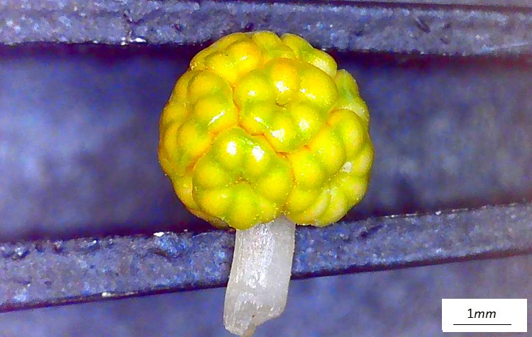 …ha forma complessa, molte brattee dalle quale emerge una sorta di capocchia.Tolte le brattee, il tutto prende forma, un brave peduncolo sormontato da un capolino di singoli ‘fioretti’ (microsporofilli), le strutture poligonali.Una isolata, in basso si intravvede un peduncolo che la collega all’asse principale del cono (‘infiorescenza’)Sezione longitudinale. Si riconoscono le sacche polliniche che pendono da squame verdognole. Quelle che dall’alto appaiono gialline. Tutte le sacche polliniche si sono aperte e staccate dalle brattee, è rimasto lo scheletro della struttura.Vista dal basso tolte alcune squame col loro peuncolo.I coni femminili sono più sfuggenti. Isolati e molto piccoli, sono formati da un involucro squamoso che racchiude un ovulo nudo.Nella foto si distinguono gli ovuli (specie nella struttura in basso) di colore più chiaro delle brattee protettive. In cima agli ovuli si riconosce un buchetto (tecnicamente micropilo), è da lì che entra il polline fecondante.Non un vero strobilo dunque, ma un ovulo protetto da innumerevoli brattee di vario colore e consistenzaIl calore della lampada del microscopio ha stimolato l’uscita della gocciolina acchiappa polline. Quando si asciuga si ritrae e porta dentro il prezioso fecondatore.Ovulo in tutta la sua nuditàL’ho sezionando sperando di osservare dettagli interni, ma i bassi ingrandimenti non consentono di riconoscere granché. Forse la struttura colorata sotto l’apertura (micropilo) è la camera pollinica, dove risiede il polline in attesa che la cellula madre dia il segnale per entrare. La regione rigonfia potrebbe essere proprio la cellula madre…