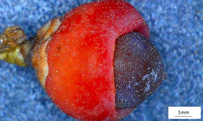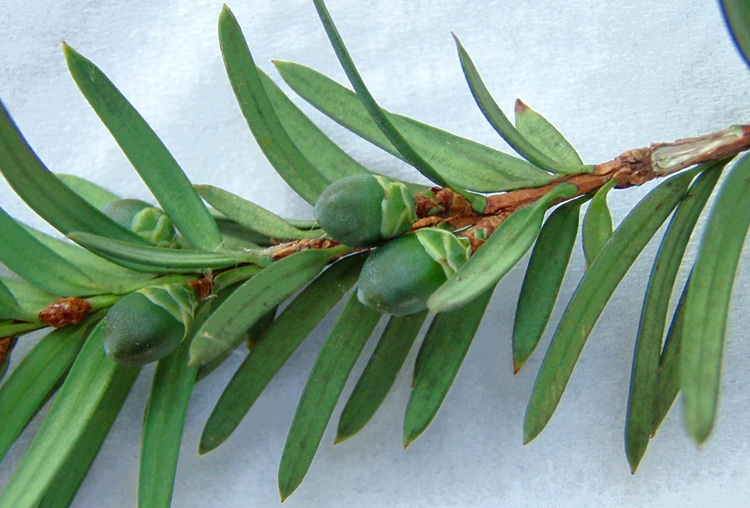 SettembreNovembreA dire il vero non si tratta di bacche, ma di un seme circondato da un arillo, è questo il termine scientifico dell’involucro così appariscente. Prima cresce il seme, sempre più scuro fino a diventare quasi violaceo,… …poi tutto attorno la parte polposa.Seme senza arilloSezione trasversale del seme. Tegumenti vari all’esterno e endosperma all’interno.La pianta sopporta bene la potatura, e i giardinieri ne approfittano per farne siepi...…e dando le forme più ridicole alle povere piante.Albero dioico, ‘fiori’ maschili e femminili separati su individui diversi. I coni maschili sono giallognoli e disposti a formare una specie di grappolo, apparentemente appeso alla pagina inferiore delle foglie…