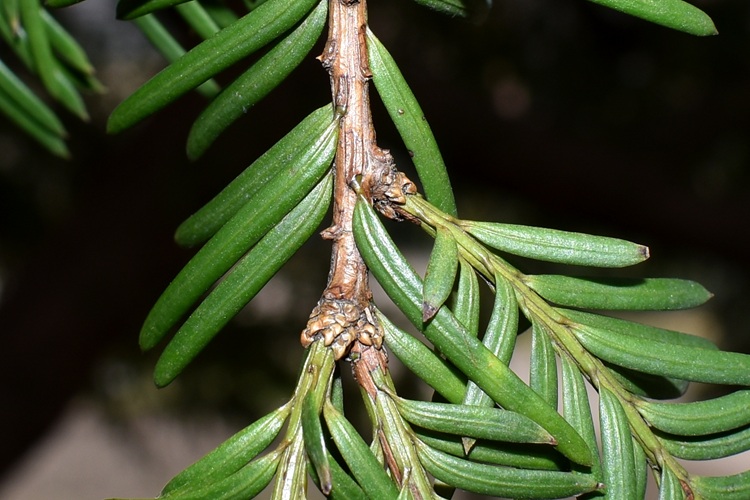 Le foglie hanno la forma di aghi piatti e appaiano appaiate sui rametti. La pagina superiore è verde scuro, quella inferiore molto più chiara.