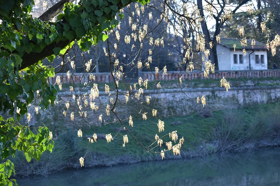 Un magnifico Acero negundo fiorito (amenti maschili) al centro di un gruppo di piante che attendono inconsapevoli (foto Marzo 2019) l’avanzare della loro ultima primavera.