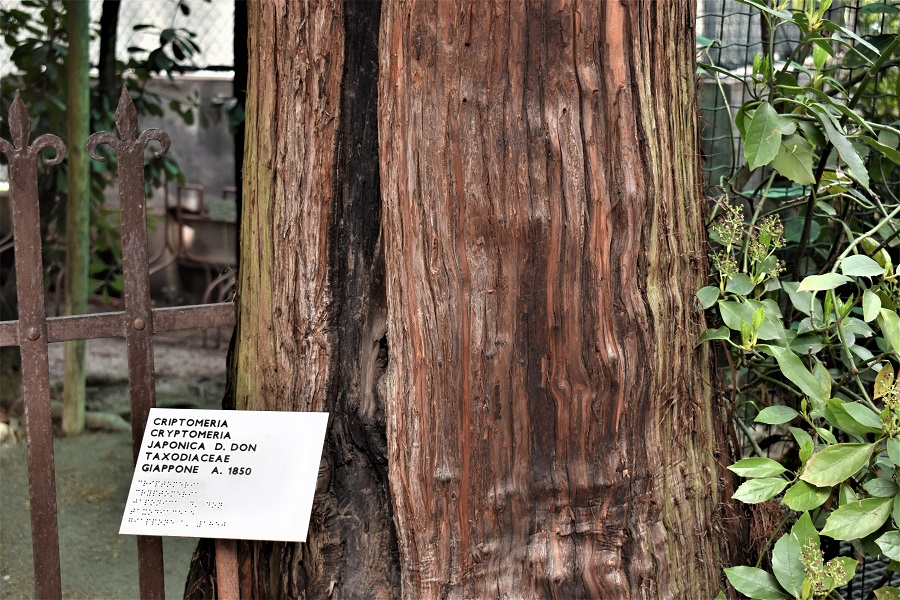 Come per molte conifere il fiore femminile ha già la forma del frutto che verrà. Qui completamente circondato da fiori maschili, curiosa disposizione piuttosto frequente per questa pianta.Coni femminili piccoli e schiviInterno. Sono visibili i minuscoli canali pronti a convogliare il polline.Se c’è qualcosa che rende unica questa pianta, sono le foglie: aghi carnosi e al contempo rigidi, dalla singolare forma ritorta.La forma evoca la lesina un suggestivo attrezzo da calzolaioAghi che tuttavia al loro apparire, in estate a partire da giugno, sembrano raccogliersi in morbidi e vellutati piumini.Il frutto è un cono munito di squame uncinate all’apice; da secco le apre completamente.Maggio. Giugno.Seccandosi si aprono e lasciano cadere i semi. Novembre.Corteccia rossiccia (Cedro rosso del Giappone è uno dei suoi nomi comuni) che si sfilaccia in lunghe strisce sottili. Questo vetusto esemplare abita il vialetto che conduce alla biglietteria dell’Orto Botanico.Ancora un individuo anziano, in un piccolo giardino dell’Ospedale Sant’Antonio. Nella foto con alle spalle un raro esemplare, per Padova, di Platano orientale. Scuola Elementare Randi in Via Piave, Criptomeria fiorita e Ligustro carico di frutti violacei.Questo interessante gruppo di sempreverdi si trova in Via delle Melette: tutto attorno al campanile della Chiesa di San Girolamo sono disposte alcune piante rare per Padova, da sinistra, nella parte ingrandita della foto: Thuja occidentalis, Cripotmeria, Thuja orientalis e, nascosto dal leccio un Pino dell’Himalaya. Parco giochi San Carlo all’Arcella, lo “scheletro” di una Criptomeria miracolosamente rimasta in piedi. Una curiosità godibile probabilmente ancora per poco.