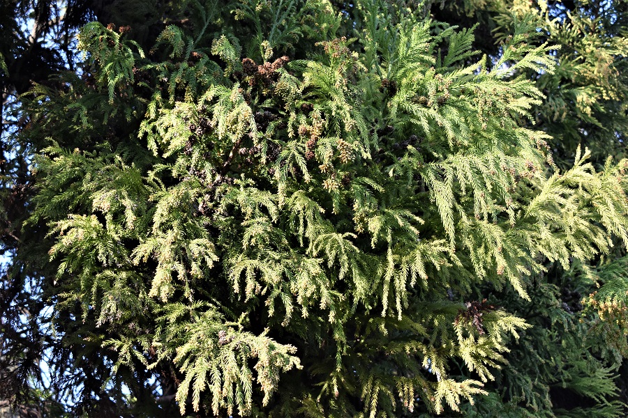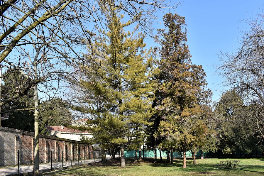 Parco dei Cigni. Cryptomeria japonica è l’albero dal colore più cupo in primo piano. Sulla destra i Platani della Passeggiata Camillotti e sullo sfondo, le bianche guglie del Monumento ai Caduti e Dispersi di Russia. Febbraio. Verde in estate l’albero diventa ruggine in inverno. Nella foto due esemplari sulla destra. Il portamento è conico, quasi colonnare, con branche folte e ben evidenti.Cormorani di vedetta sulle cime dei platani di Passeggiata Camillotti. Di certo arrivati dalla Laguna in queste fredde giornate invernali.Giardino Città dei Bambini in Via S. Eufemia. Il Nostro è l’albero ramato a destra. A sinistra un Pino dell’Himalaya.Il gruppo della foto precedente da diversa prospettiva e con luce differente.Un altro piccolo gruppo di Cryptomeria all’estremo opposto del Giardino, verso il muro che lo separa dal Complesso Sportivo Pedron. In fondo un Cipresso e vicino un Calicanto d’inverno, anch’essi vecchie conoscenze.L’albero fiorisce fra Gennaio e Febbraio. Un motivo in più per uscire di casa e fare la sua conoscenza.Allo sbocciare dei fiori maschili si colora di bellissime macchie gialle, poi rosseggianti col passare del tempo. Questo il motivo dei diversi colori dell’albero sia colle stagioni sia col cambiare della luce nel corso di una stessa giornata. Un paio di settimane dopoIl cono maschile è un amento formato da minuscole squame che proteggono le sacche polliniche.Fiori ormai appassiti, in aprile, alle stremità dei caratteristici rametti completamente ricoperti da stravaganti aghi.