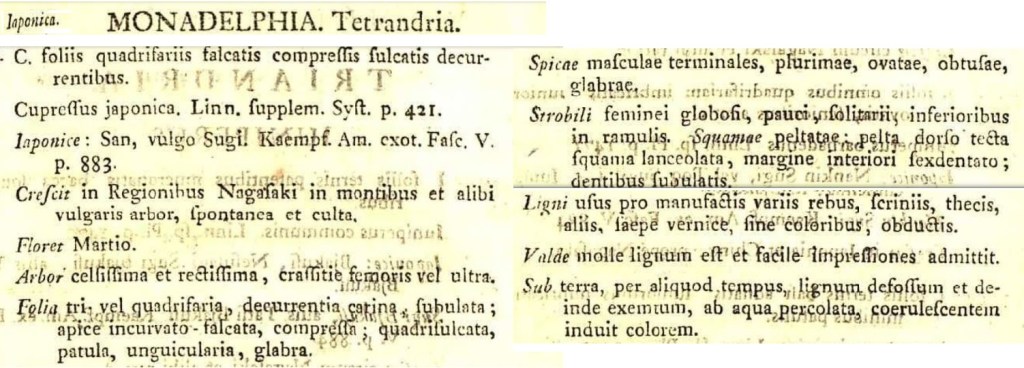 Nel 1782 (in copertina è indicato 1871) il figlio di Linneo (Carl von Linnè) nomina il cipresso rosso del Giappone Cupressus japonica – pagina 421Supplementum plantarum Systematis vegetabilium, Braunschweig. Linneo fa riferimento a Thunberg ma non può essere Flora japonica poiché è del 1784, deve trattarsi di altra pubblicazione. Ad ogni buon conto a noi interessano i caratteri che dalla foglia ai fiori possono valere come ripasso.