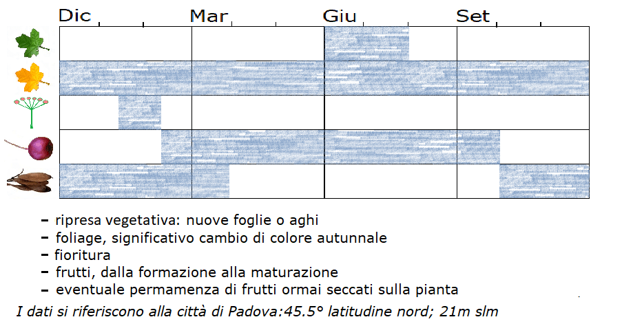 Fenologia minima: risveglio vegetativo, fioritura, fruttificazione. L’albero cambia colore più volte l’anno: verde chiaro coi nuovi aghi in estate, ruggine nei mesi invernali tranne alla fioritura quando i coni maschili lo ingialliscono.Areale di origine (native range), Giappone.