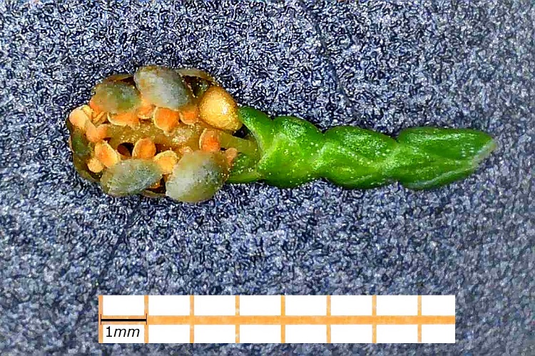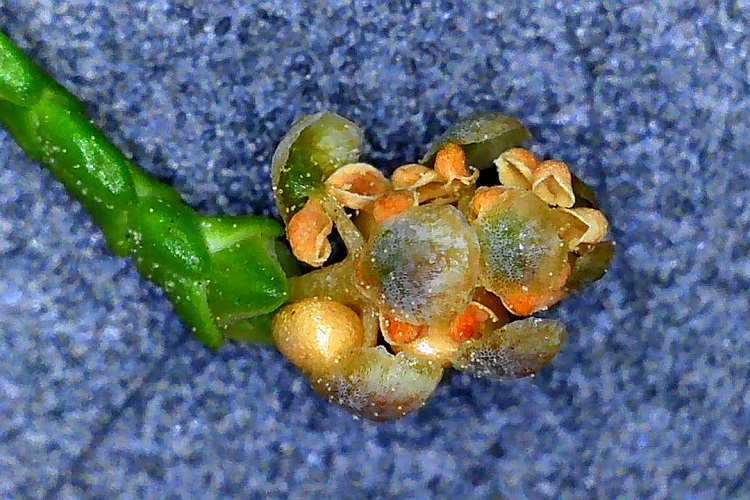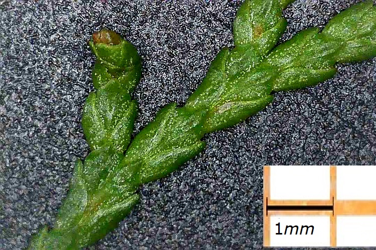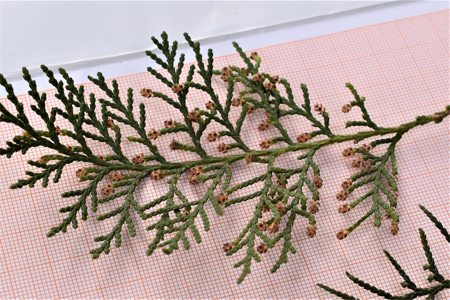 Frutto in giugno: squame uncinate e sovrapposte; colore glauco; dimensioni modesteLe squame schizzano all’infuori con angolo anche maggiore di novanta gradi.Sezione longitudinale e trasversaleAsporto di una squama; vale la pena asportare una squama per toccare con mano quante poche esse siano.A maturazione le squame si aprono e rimane un involucro a mo’ di rosetta legnosaLa pianta fiorisce in febbraio. Questa foto di Aprile mostra i frutti appena formatiQuando il cono si apre, qui in Ottobre, lascia cadere minuscoli semi senza ali.Fiori maschili, inizialmente giallo limone si imbruniscono quando emettono il polline.Dalle minuscole dimensioni, sono in forma di amenti con un asse centrale e diramazioni che portano in cima squame protettive.Sotto ogni squama alloggiano due sacche polliniche che si aprono a maturità. Questa incredibile foto mostra una sacca pollinica volutamente staccata dal suo supporto e rimasta miracolosamente illesa.Fiori femminili. Come per la gran parte delle conifere il fiore femminile ha la forma del frutto che verrà.Particolare. Le secrezioni aiutano la penetrazione del polline.Le foglie sono microscopiche, meno di 1 mm,… …e disposte su rametti curiosamente piatti… …di colore verde intenso, in primavera-estate, su entrambe le pagine; d’inverno tendono a diventare più gialline o rossicce.