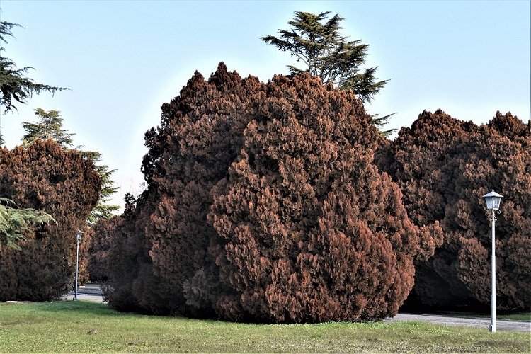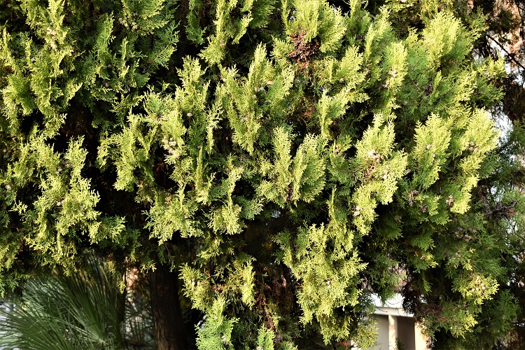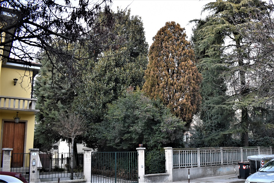 Bellissima Thuja orientalis al Parco dei Cigni, Via Goito.Thuja orientalis piramidalis, rami e rametti disposti in piani verticali.Particolare della foto precedente che mette bene in evidenza il gioco dei rametti appiattiti. Questa Tuia orna l’entrata di un condominio in Via Carducci.Gennaio. Suggestivo colpo d’occhio all’entrata del Cimitero Maggiore in Via Chiesanuova Particolare. Il colore invernale di molti individui di questa specie è rosso ruggine.Via Palestro, presso la Breccia di San Prosdocimo, una siepe fitta e impenetrabile allo sguardo che cambia colore tre volte l’anno. Qui in aprile.