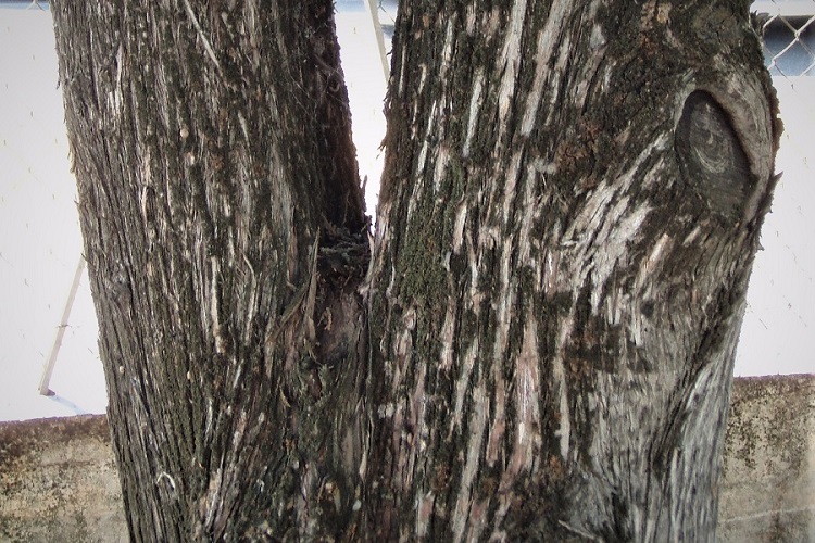 Si sfilaccia in strette strisce che si sollevano dai tessuti sottostanti e cadono dopo molto tempo.In molti esemplari il tronco propende a ramificarsi sin dalla base. Via Raggio di Sole.