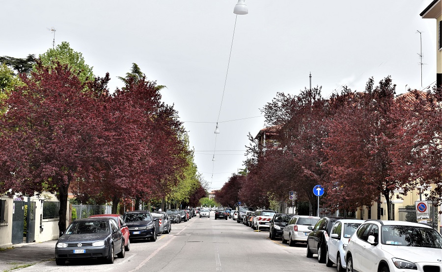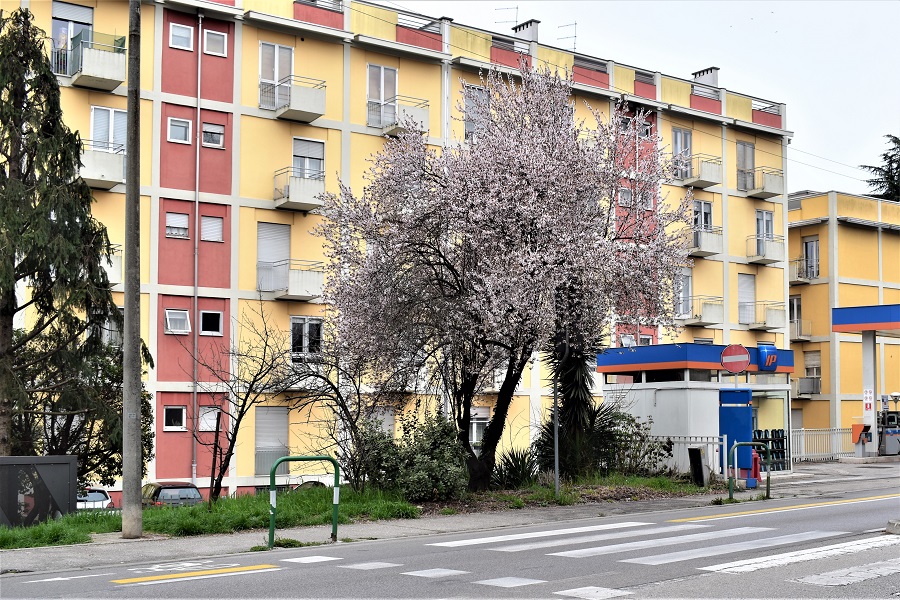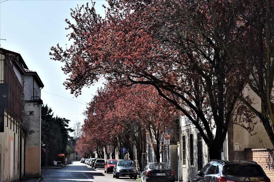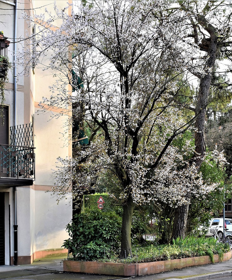 Lo vedete?, appena un accenno di frutto. Il peduncolo è lungo e glabro.Il frutto di un portainnesto che in questo caso è evidentemente un susino (Prunus domestica)Via Goito. Questo albero che abita un’aiuola in prossimità di una stazione di servizio……ha il tronco che si biforca alla base. Un innesto basso.Due, anzi tre, giovanissimi esemplari ai Giardini Città dei Bambini in Via Sant’Eufemia.Orto Botanico in novembre.Via Santa Maria in Vanzo, verso la Chiesa di Santa Croce. Via Cristoforo Moro, 28 Marzo 2018……e il 22 Marzo di un anno dopo. Dal che si evince una certa variabilità nell’inizio della Primavera.Via CarducciVia Piave