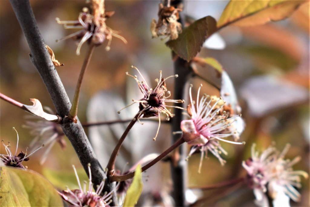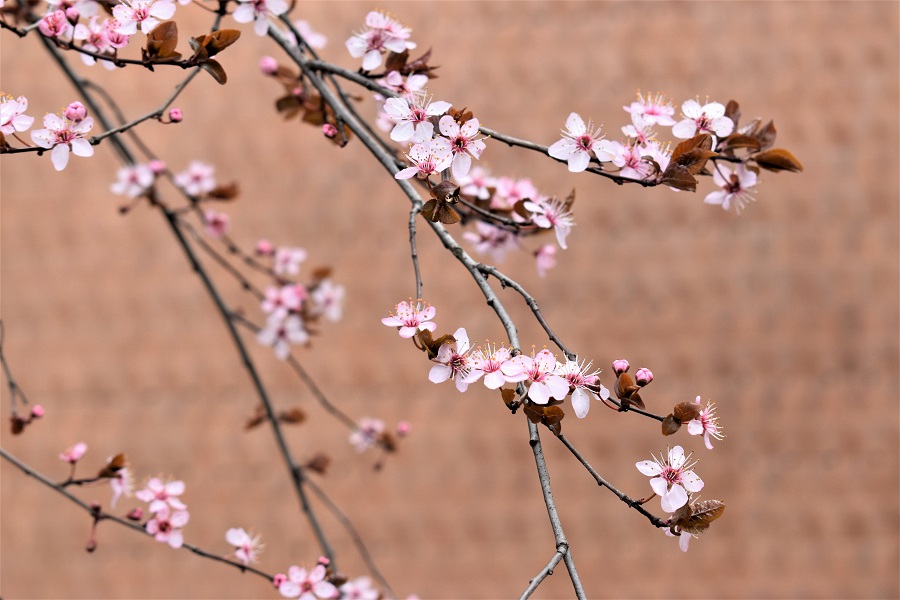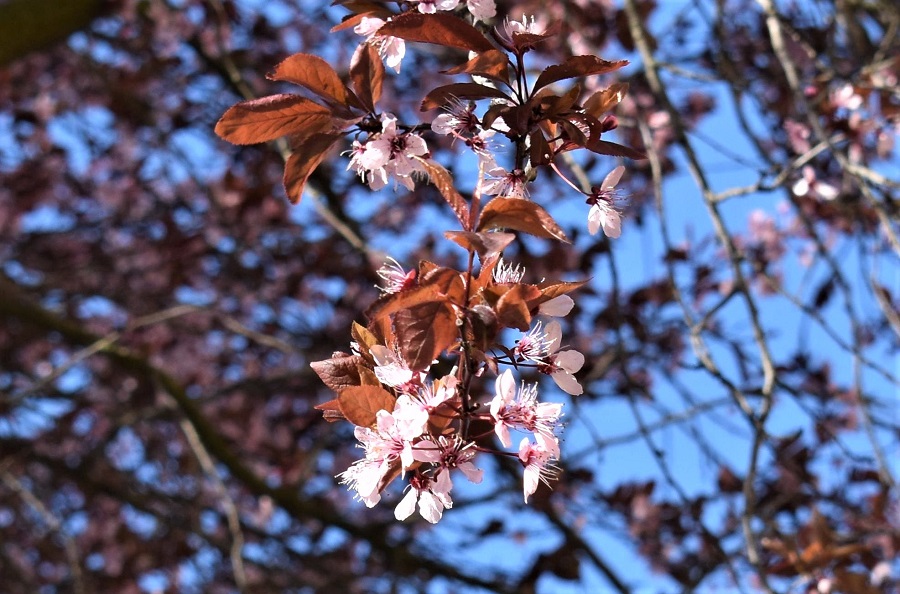 Prunus cerasifera Pissardii fiorisce prima di mettere le foglie e questo ne aumenta il fascino contribuendo al suo successo presso i giardinieri. I fiori con cinque petali rosa chiaro, a volte quasi bianchi, sono di dimensioni contenute. Di fatto, l’eroe di questo post, è una varietà di Prunus cerasifera, il ben noto Amolo o Mirabolano, e le due piante hanno i fiori che differiscono solo per il colore.