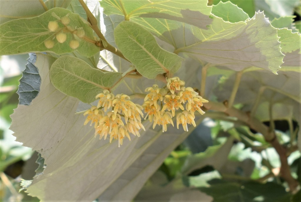 La foglia di Tilia tomentosa, coperta da una leggera peluria e con la pagina inferiore di colore grigio argento.Il fiore del tomentosa, simile all’americana sia nella forma sia per la presenza di staminodi.Un giovane esemplare al Parco Europa. Il colore è esaltato dal vento.Poderoso Tilia tomentosa in Viale Codalunga.