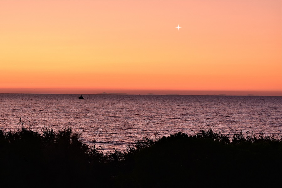 Nella foto precedente avevo barato un po’, ma sapevo che sarebbe bastato aspettare per ritrarre Venere mattutino (Stella del Mattino). Questa foto è del 6 Luglio 2020, il caso ha voluto che si vedesse ancor meglio una barca di pescatori che può fare a dovere le veci del vascello dell’Angelo Nocchiero.