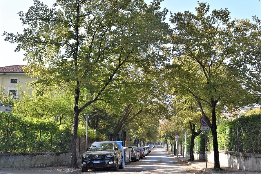 Giovanissimo esemplare in Via Monte Cengio.Via Montello. Doppio filare di giovani esemplari; Ottobre 2018.