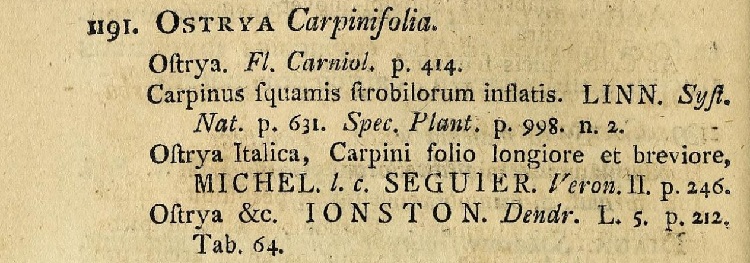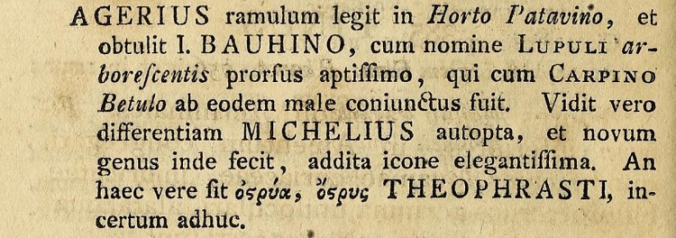 Leggendo l’intero paragrafo ho trovato un riferimento all’Orto di Padova, troppo ghiotto per non segnalarlo. Devo la traduzione a Giuliana Z.“Agerio raccolse un rametto nell’Orto patavino e lo mandò a Bauino, con il nome di Lupuli arborescentis senz’altro adattissimo, il quale con il carpino bianco fu malamente connesso dallo stesso. In realtà vide la differenza Michelius […], e quindi fece un nuovo genere, aggiungendo una immagine raffinatissima. O forse questa fu veramente l’ό σ ρ ύ α, ό σ ρ υ σ di Teofrasto, finora incerta.”