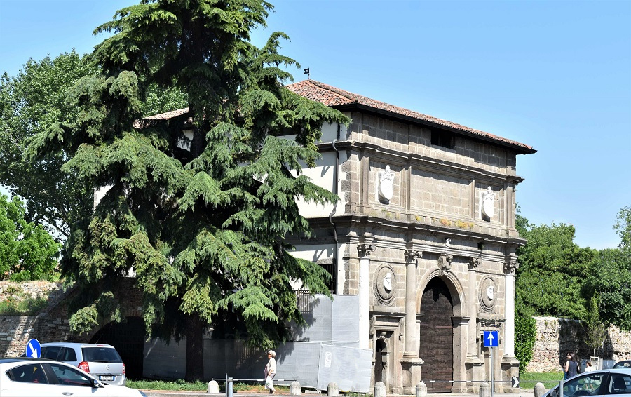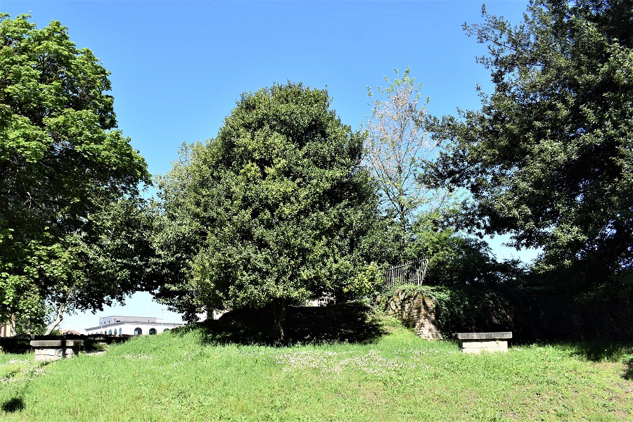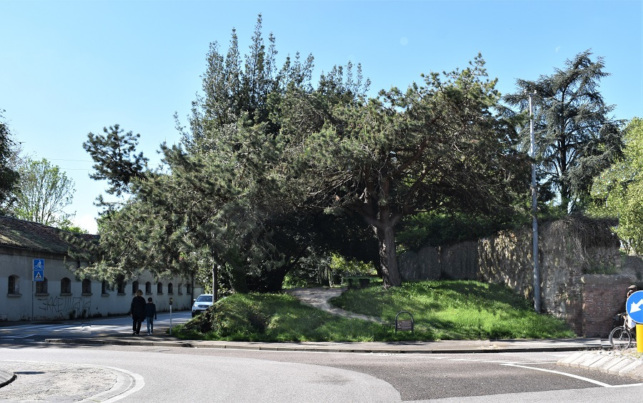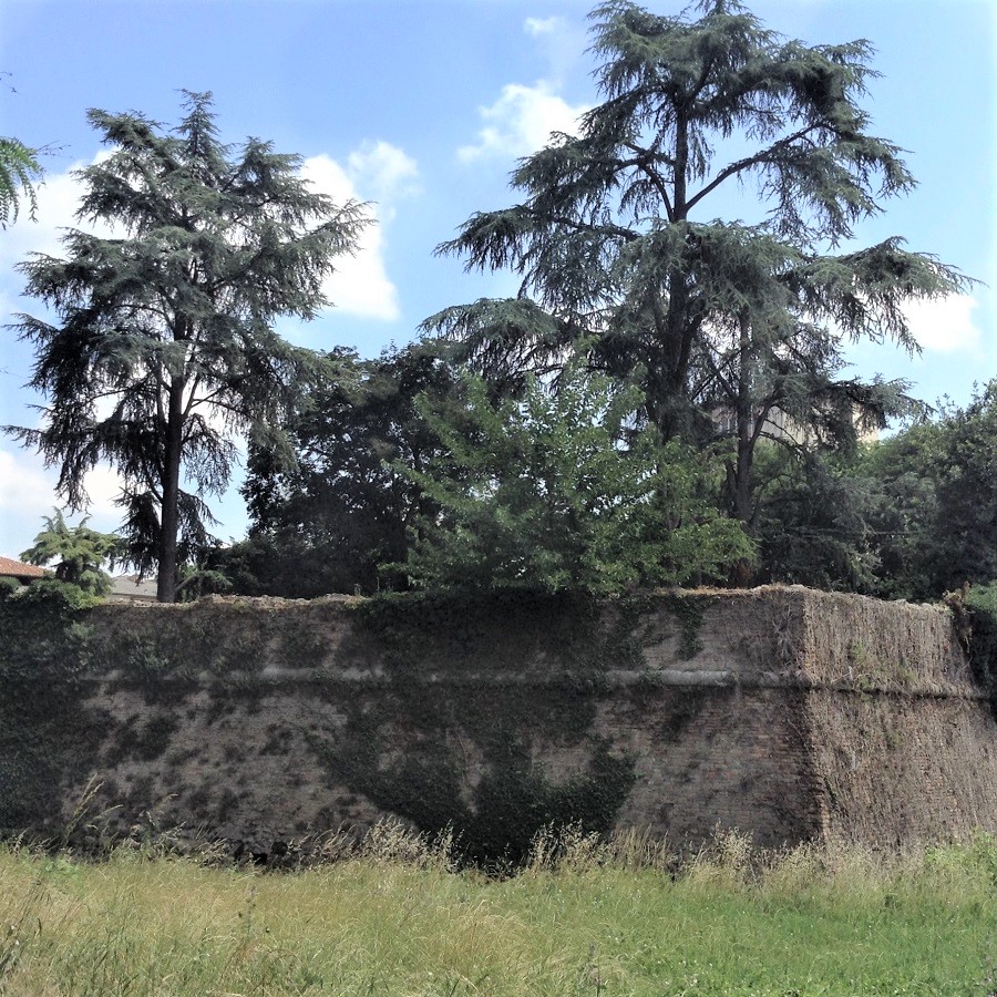 Il Baluardo Savonarola, qui visto da Via Volturno, è sede di un giardinetto ricco di specie diversissime.Porta SavonarolaIn primo piano un Pinus sylvestris. Un breve sentiero porta dal livello della strada alla sommità del Baluardo. A sinistra Via Orsini. Dopo il Pino e un Alloro, si incontra un albero, quello al centro nella foto, che da lungo tempo avevo classificato come ignoto.