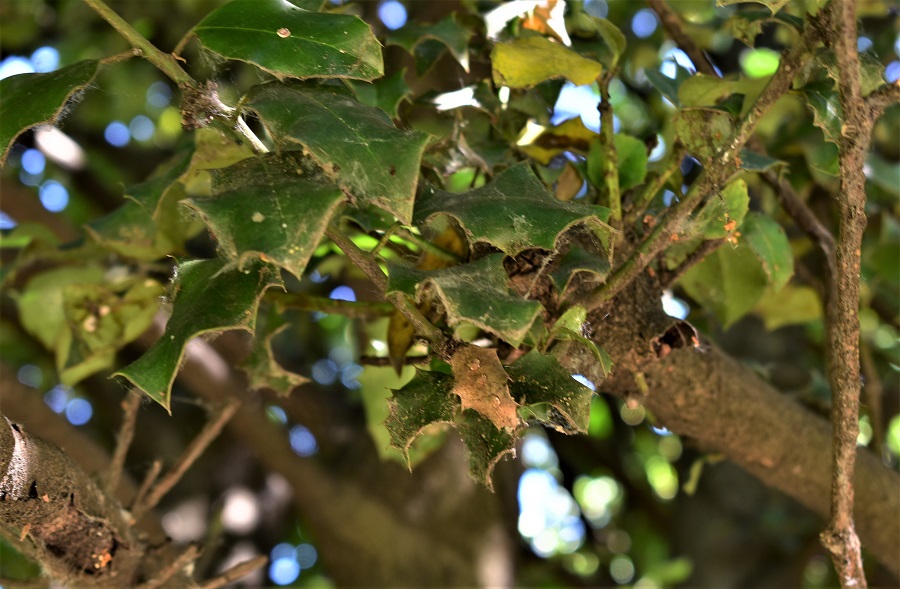 Naturalmente restava a questo punto da giustificare la mancanza degli aculei sul margine della foglia. Cosa prontamente spiegata da uno dei miei fedeli manuali: O. Polunin, Guida agli alberi e arbusti d’Europa, Zanichelli, 1977, pag. 129. Le foglie lucenti e coriacee hanno generalmente aculei pungenti sul margine ondulato, sebbene possano anche avere margine liscio […] particolarmente sugli alberi più vecchi.