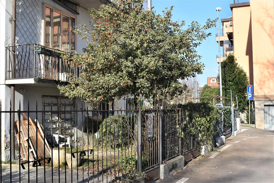 Recupero questa vecchia foto. E realizzo che si tratta di un fiore maschile: inconfondibili, ma soltanto adesso, poiché sapevo cosa cercare, le grosse antere cariche di polline. Ecco spiegato il motivo dell’assenza di frutti sulla pianta! Questi fiori avevano svolto il loro compito, che non era quello di essere fecondati…Senza por tempo in mezzo cerco il fiore femminile di Ilex agrifulium.Trovo questo di una pianta in un giardino privato. E riconosco immediatamente, nel bottoncino gialloverde, il pistillo. Un ingrandimento per apprezzarne tutte le parti, in particolare un insolito pistillo con quattro stigmi e l’ovario chiaramente sagomato in altrettanti settori (tecnicamente quattro carpelli). Frutti dell’agrifoglio sono drupe rosse e carnose.Di circa un centimetroResiduo del caliceE dello stigmaAll’interno un nocciolo curiosamente sagomato e coriaceoDifficile estrarre il seme.Ed ecco un bell’esemplare di agrifoglio, come uno se lo aspetta. Via Monte Santo, nei pressi di Via Palestro.