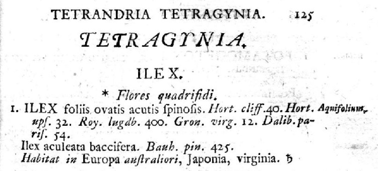 Ilex aquifolium L. Il nome fu imposto da Linneo nel primo tomo di Species Plantarum (1753) a pagina 125