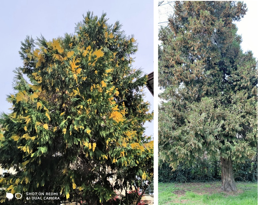 Libocedro, quartiere San Carlo, simile per tipo di aghi-foglia appiattiti, chioma e tronco a quello del Parco.(Foto, Paula; commento, Chiara)Libocedri, a destra al Parco San Carlo, a sinistra nel quartiere. (Foto, Matteo)Lezione di Alberi, tutti attorno al Libocedro fiorito.