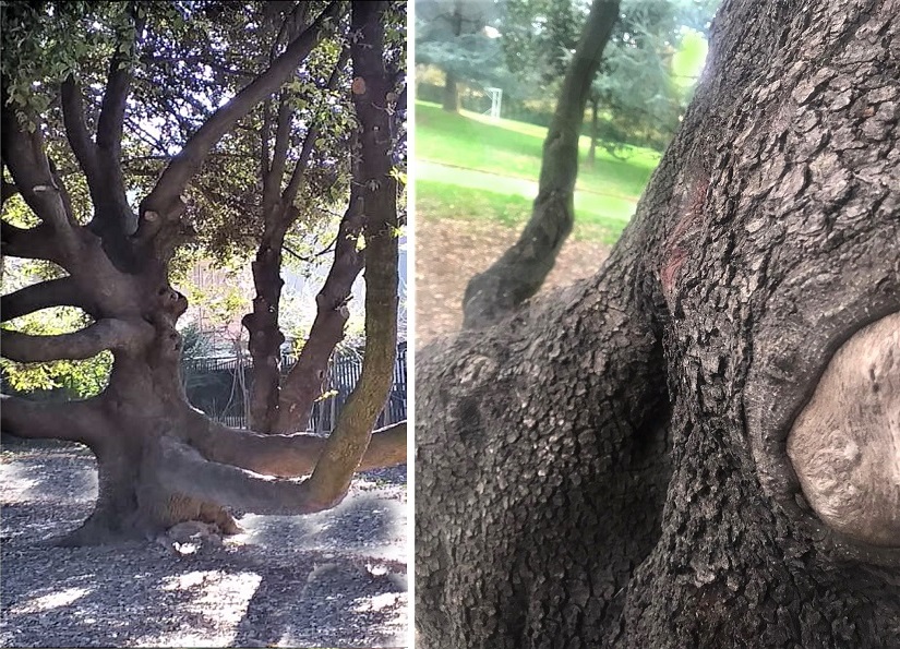 La Quercia Leccio produce ghiande. Le foglie si presentano con una colorazione verde sulla parte superiore, su quella inferiore è presente una certa peluria e sono di colore bianco. La sua corteccia è molto compatta, a differenza del Pino domestico.(Foto a sinistra Daniele, a destra Paula; commento, Daniele)Pinus pinea, e particolare della corteccia. (Foto più grande Matteo; foto piccole, Daniele)