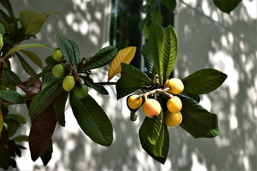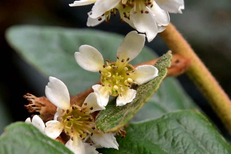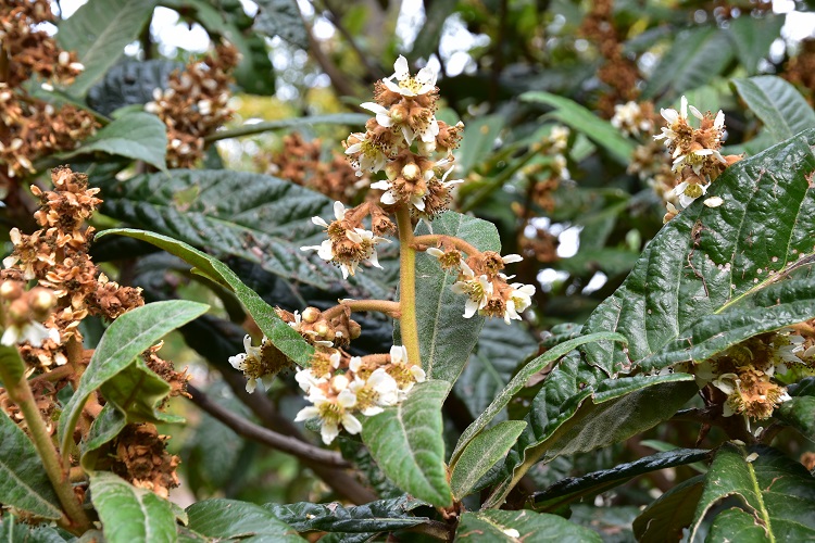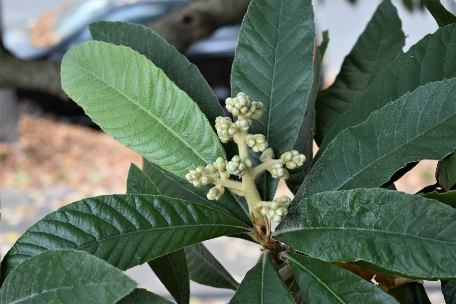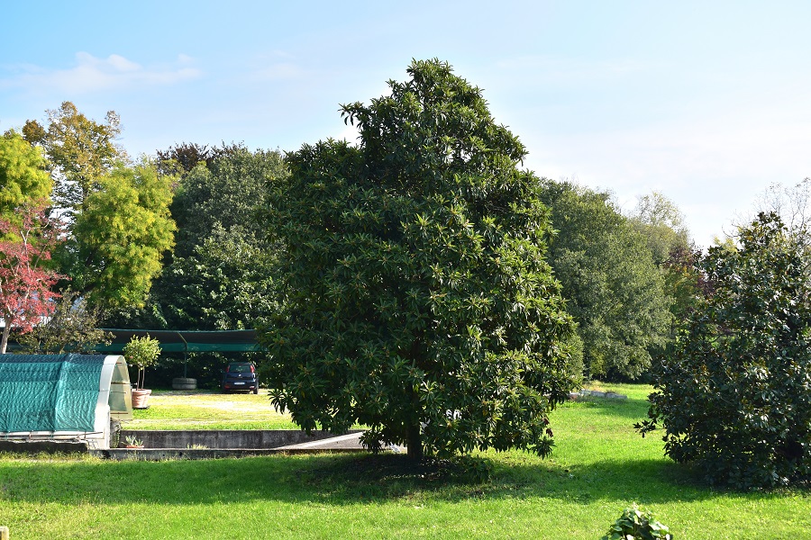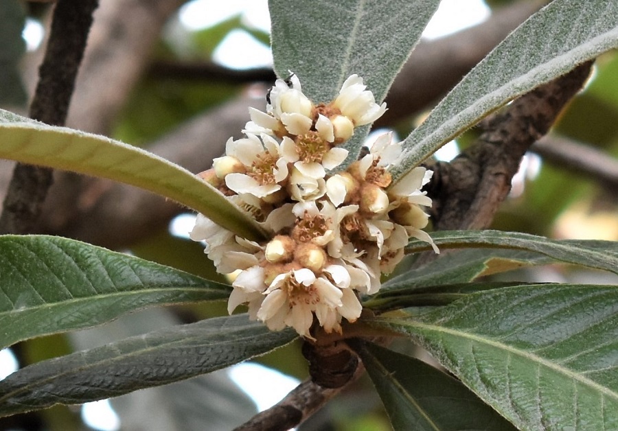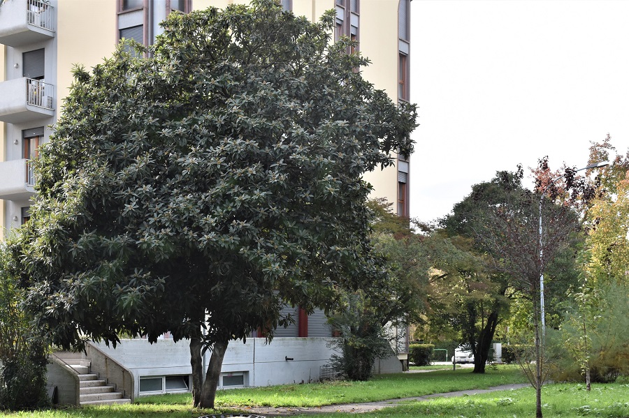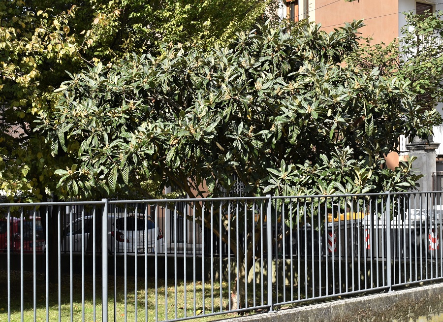 Quando il fiore è in bocciolo si distingue bene la forma delle infiorescenze; e si intuisce il motivo del nome del genere. Profumo intenso di mandorla amaraFiore a simmetria pentagonale, petali biancocrema ben separati grazie all’ampio ricettacolo. Numerosi stami sormontati da antere gialline, pistillo che si divide in cinque o quattro stili.Sepali piccoli e pelosi, ma c’è lanugine un po’ dappertuttoNon è facile osservare l’interno del fiore, una sezione può aiutare. Nella foto si distingue bene lo stilo diramarsi in quattro e gli stigmi turgidi alle estremità. Eliminati gli stami il tutto diventa più intellegibile.Sezione longitudinale dell’ovarioOvario infero (si distinguono quattro ovuli), al centro il tegumento che sostiene gli stami.Foglia grande, coriacea, con bordo dentato o anche liscio. Di colore verde intenso la pagina superiore, grigia e tomentosa quella inferiore. Peduncoli e giovani foglie lanuginosiCorteccia grigiocrema e liscia.Un esemplare in Via San Pio X, uno dei pochi messi a dimora dal comune.Giardino delle TamericiVia Pio X, in prossimità del Monumento ai Caduti di Russia. Qui vivono alcuni Nespoli del Giappone, un altro esemplare nella prossima foto Via Santa Maria in Vanzo in novembre Ridente giardino lungo il Piovego poco dopo il Ponte di Ognissanti Via Cerato angolo Via Acquette.Corso Milano, il cortiletto di un ristorante. Pochi sono gli alberi su questa strada. Vi hanno da poco fatto una pista ciclabile, si spera che gli amministratori facciano la scelta coraggiosa di renderla zona pedonale; e che magari diventi una striscia boschiva. Esemplare in Ghetto (Via dell’Arco) carico di frutti.Uno splendido esemplare, lasciato libero di crescere senza potature. Si trova nei Giardini del Comune adiacenti il Cimitero Maggiore.