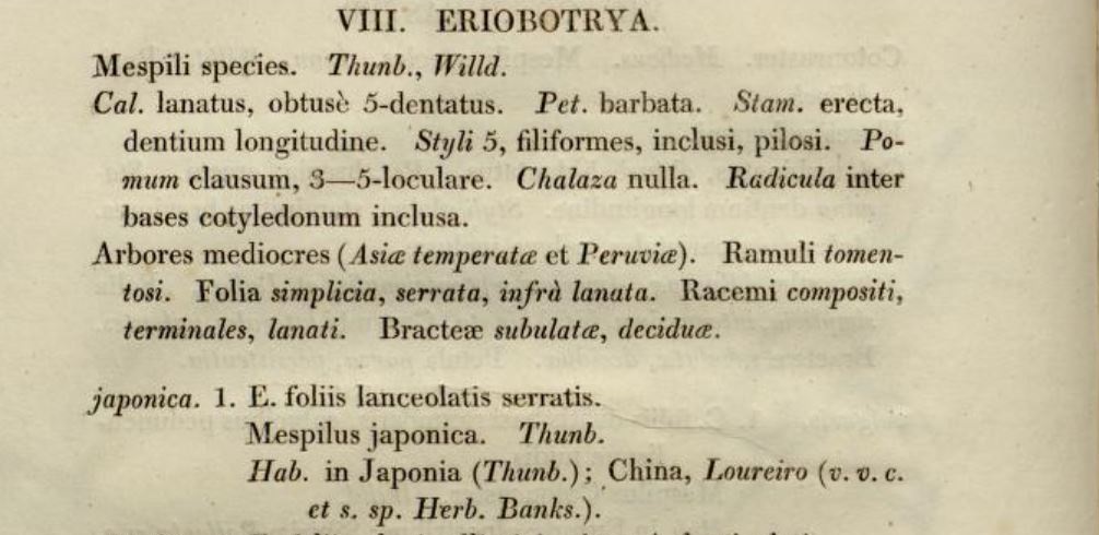 La pagina incriminata. In alto l’assegnazione del genere (con il riferimento ai precedenti autori che avevano attribuito l’albero al genere Mespilus) di cui segue una dettagliata descrizione. Compaiono riferimenti a precedenti autori che avevano attribuito l’albero al genere Mespilus, tra questi c’è Thunberger (allievo di Linneo). Il nome della specie appare più in basso assieme a scarne note.