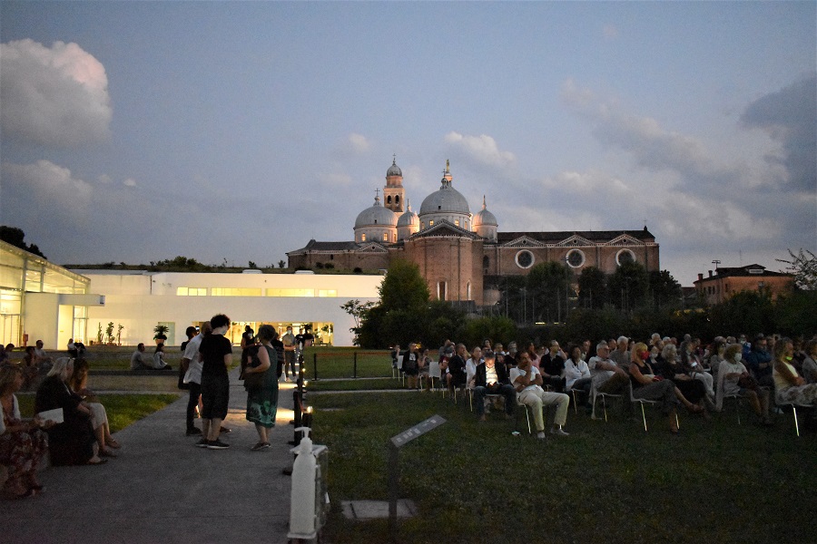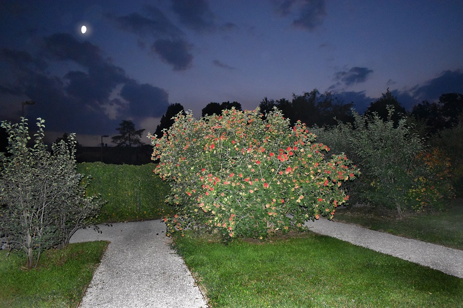 La porta nordPresso questa entrata abita una Araucaria araucana, la pianta in fondo sulla destra. In primo piano una Agave sp (forse americana) in vaso. Esposta in bella vista certo in occasione della fioritura: una sola volta nella vita… Sophora japonica pendula vista dall’interno. Si trova vicino alla porta est.La mappa dell’Orto antico (Orto dei Semplici). Per l’occasione a tutti gli abbonati sono state regalate quattro stampe, questa foto riproduce il recto della busta che le conteneva. L’ho riprodotta come ausilio all’orientamento. Per esempio, ‘Tramontana’ indica la porta nord, quella verso il Santo, ‘Ostro’ la porta sud, verso le nuove serre.Cotinus coggygria colmo di frutti. Si trova nello ‘Spaldo terzo’ che si incontra sulla sinistra entrando dalla porta est, da dove siamo appunto venuti.Volgendo le spalle al Coggygria, quindi guardando verso ovest, ecco lo splendido e secolare Ginkgo biloba. Oltre la Metasequoia glyptostroboides (pianta dal nome impossibile e dalla bella forma a cono) la Luna al suo primo quarto si sta avviando al tramonto. Direzione sudovest. La serra che racchiude la Palma di Goethe, Chamaerops humilis, l’essere vivente più vecchio della città (salvo smentite, è bene andarci cauti con questo genere di affermazioni…), piantata nel 1585. Superata la porta sud ci dirigiamo verso le nuove serre. L’ampio spiazzo ha ospitato una iniziativa botanico-gastronomica: tutta questa gente è stata nutrita a gelato per buona parte della serata! Sullo sfondo la Basilica di Santa Giustina. Ancora la Basilica, fotografata questa volta con una esposizione più breve. Oleandri sulla destra; descritti in un recentissimo post.Viburnum lantana carico di frutti. Il tempo è passato e la Luna si dirige velocemente ad ovest, tra un paio d’ore tramonterà.Le nuove serre riprese dalla terrazza del complesso che ospita le sale per le conferenze. Ritorniamo sui nostri passi, e poco prima di riattraversare la porta sud, ci godiamo sulla sinistra l’arboreto, col lungo vialetto che conduce all’entrata.Siamo ritornati all’interno dell’Orto antico. Sullo sfondo le cupole del Santo.E prima di uscire per la vecchia entrata, che stava di fronte al ponticello sul Canale Alicorno, diamo un’ultimo saluto al venerando Platano orientale, uno dei simboli dell’Orto.