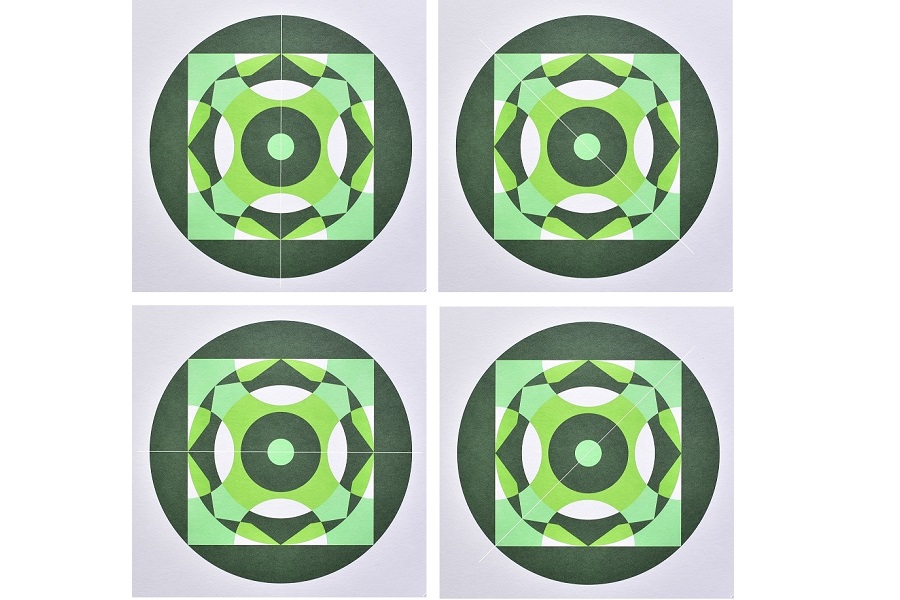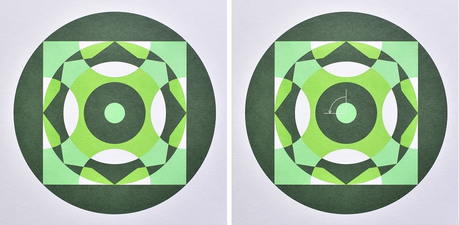 Come si è detto tutte in un modo o nell’altro prevedono quadrati inscritti in cerchi e viceversa, ma ognuna lo fa utilizzando motivi, colori e ‘trucchi’ diversi. Molte figure geometriche, ad esempio, non hanno contorni ben definiti, ma distinguibili (immaginabili?) con l’ausilio di diverse regioni colorate. Si pensi (prima stampa in alto a sinistra) al cerchio inscritto nel quadrato che a sua volta è inscritto nel cerchio più grande.