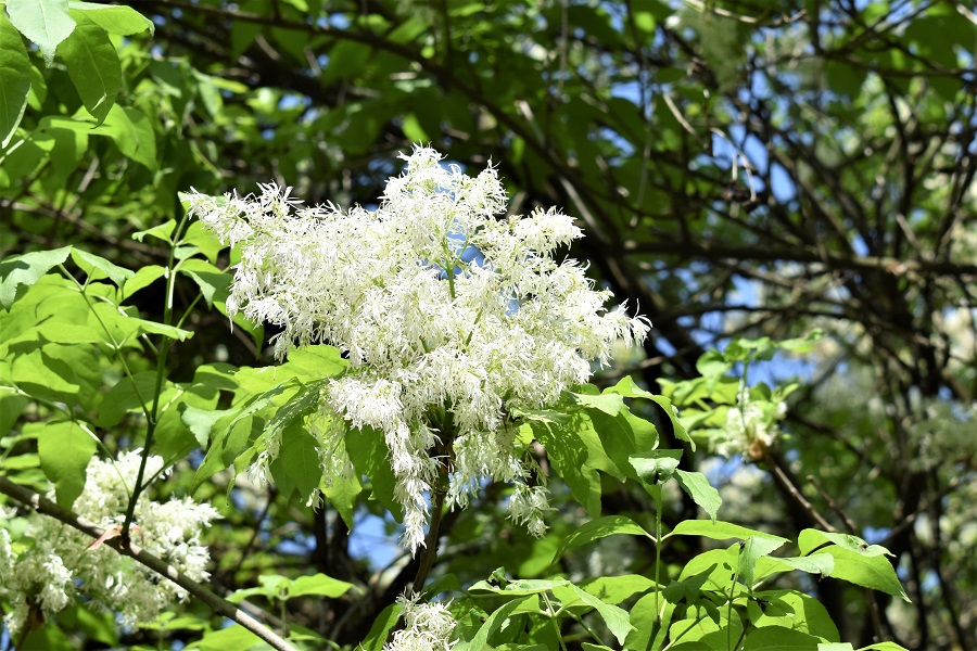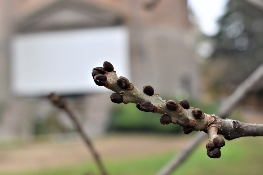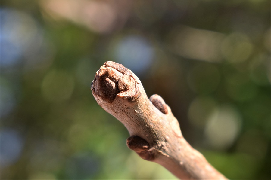 Foto del 26 Aprile 2018. Dei quattro frassini l’Orniello è l’unico che fiorisce dopo aver messo le foglie. Ed è anche l’unico ad avere fiori muniti di corolla. I fiori secchi permangono sulla pianta per tutta l’estate. Grossi gangli marrone poco estetici ma utili al Cercatore di Alberi. Gemma invernale inconfondibile, piatta e grigia.E quando manca di fiori, o dei loro resti, c’è la corteccia, liscia e grigia, che lo distingue dalle altre tre specie.Le foglioline sono tondeggianti come l’americana, ma mancano della punta pronunciata.
