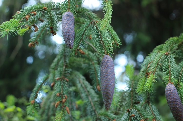 Sono rimasto sorpreso dai tanti colori che possono assumere le pigne – ovvero una modificazione dei coni femminili una volta che vengono fecondati dal polline: il loro colore va dal verde al castano chiaro fino al marrone-violaceo. Una volta identificato che si tratta di un abete, il portamento delle pigne non lascia dubbi al conoscitore poco più che neofita: se sono pendule si tratta di abete rosso, se sono ritte all’insù, si tratta di un abete bianco (Abies alba) o di un altro abete. Un altro carattere diagnostico riguarda la forma degli aghi, ma richiede un’osservazione più ravvicinata: gli aghi sono appiattiti nell’abete bianco e a sezione quadrangolare nell’abete rosso.