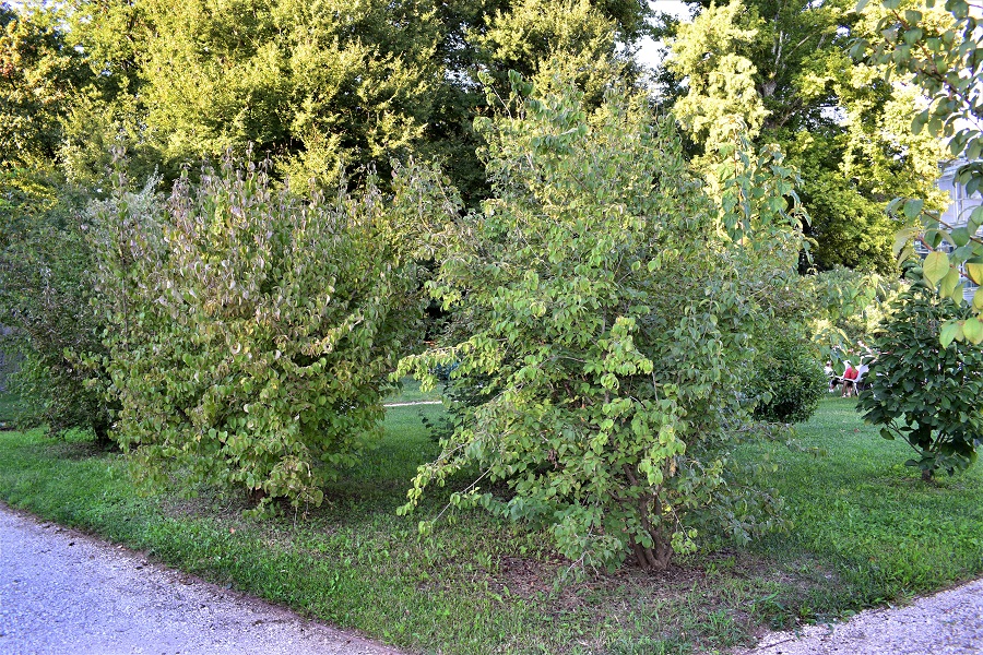 In primo piano Cornus mas. Frutti neri, carnosi e lucenti. In verità di solito rossi, ma dipende anche dalla temperatura media della stagione, pare.Le foglie, tipiche del genere Cornus con le venature secondarie che tendono a seguire il bordo.L’incredibile frutto di Cornus kousa, un alberello di origine giapponese. E queste le foglie.Portamento arbustivo. Una sera successiva all’evento. Dietro una giovane Paulonia.