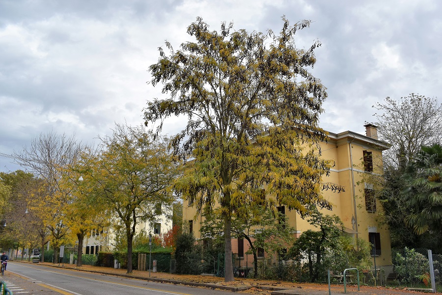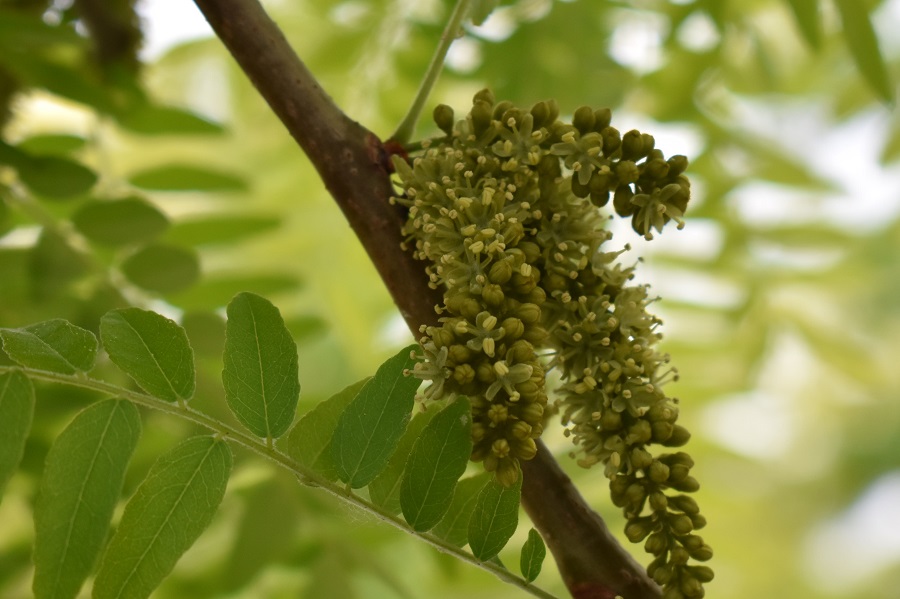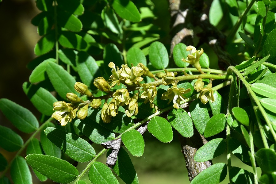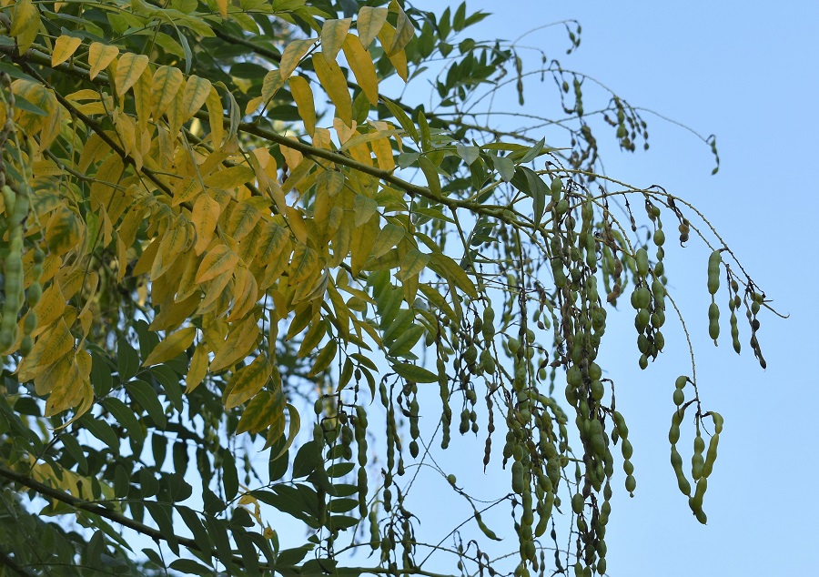 – fiori biancoverdognoli su candelieri reclinati – frutti: baccelli segmentati – corteccia simile a quella della Robinia – chioma tondeggiate