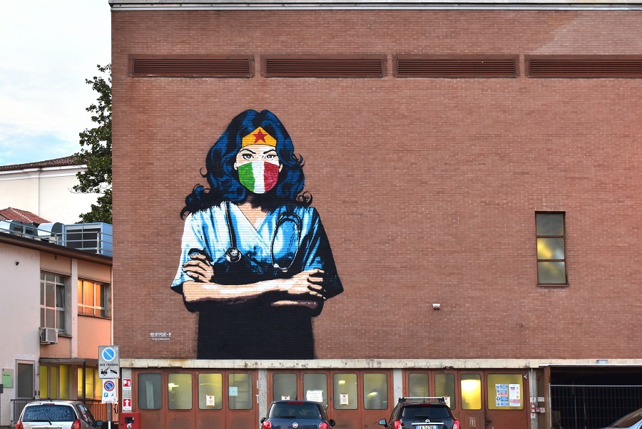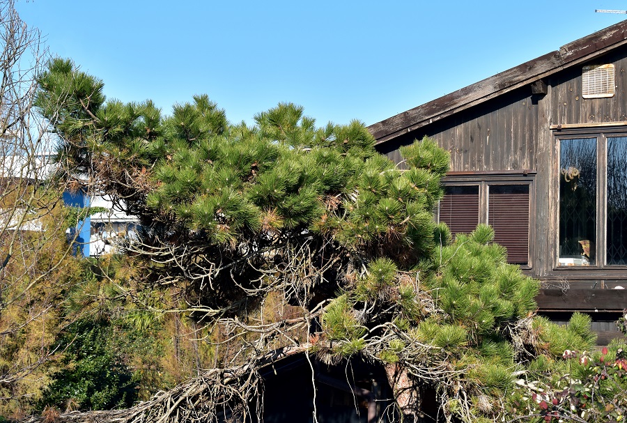 I lunghi aghi di Pinus pinaster (Pino marittimo) che si espandono in tutte le direzioni danno ai rametti, e dunque al contorno, una forma ancora diversa, come di tante stelle filanti accese contemporaneamente.Anche il colore quasi glauco degli aghi contribuisce al fascino che questo albero esercita su chi lo osserva.Murazzi, Lido di Venezia.Ospedale Giustinianeo, dalla rampa sopra il Pronto Soccorso.E dalla stessa rampa si vede anche questo murales.