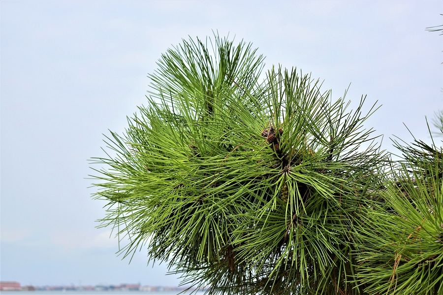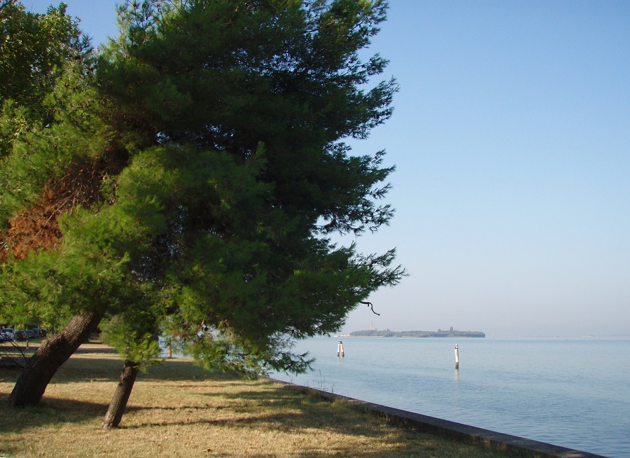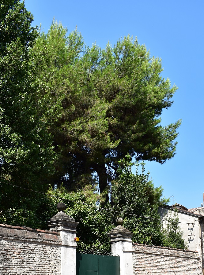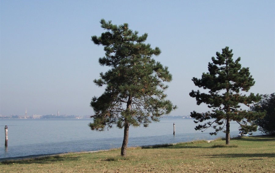 Diversa ancora è la forma dei rametti terminali nel Pino d’Aleppo: gli aghi sottili si discostano lievemente dalla punta del rametto, e ancora una volta torna l’immagine del piumino da polvere, ma di quelli fatti con le piume; ne vendono ancora? Sullo sfondo la Laguna con l’Isola di Poveglia, vista dal borgo di Malamocco.Ancora Poveglia ma la foto è presa dal Lido .L’unico halepensis di Padova, che io sappia. Si trova in un giardino privato, riparato da un alto muro, in Via Briosco.