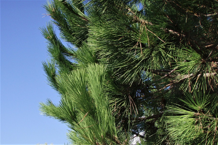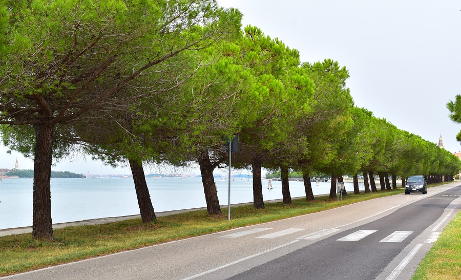 Gli aghi lunghi e sottili del Pino domestico seguono l’andamento dei rami, e quelli in cima si fermano alla stessa altezza, dando al rametto terminale l’aspetto di certi piumini per la polvere.Un filare di giovani pinea al Lido di Venezia, la strada fra Malamocco e gli Alberoni Giardino delle Tamerici